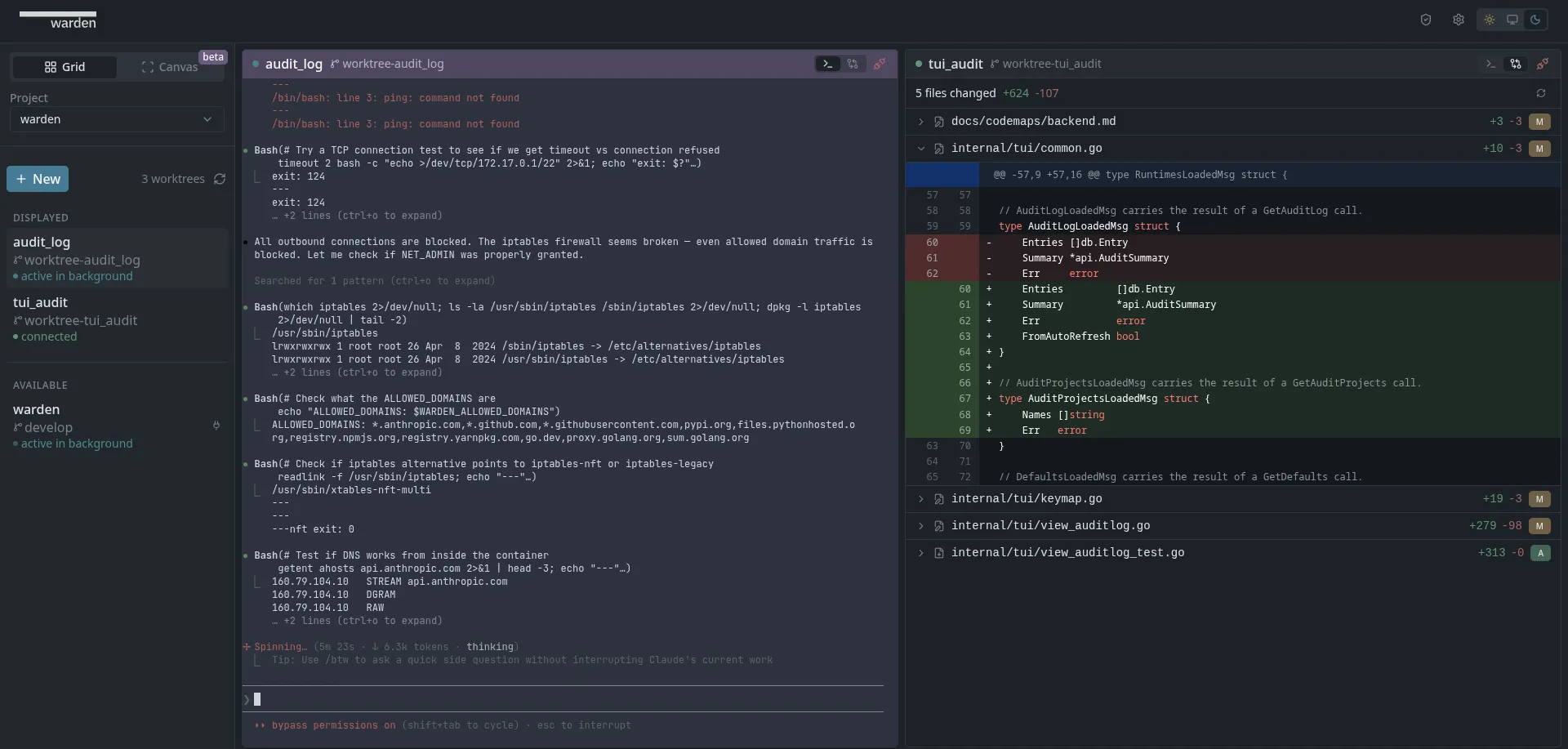 Run multiple agents on the same repo simultaneously, each in its own git worktree. Isolated branches, no merge conflicts, no stepping on each other. Warden orchestrates creation, cleanup, and status across all of them.